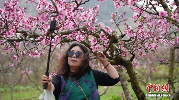 图为3月17日,搭客正在贵阳市北亮区永乐城的桃花林里摄影挨卡。石小杰 摄