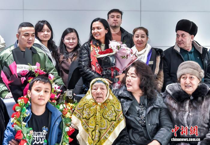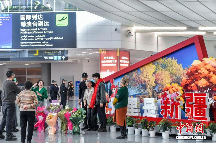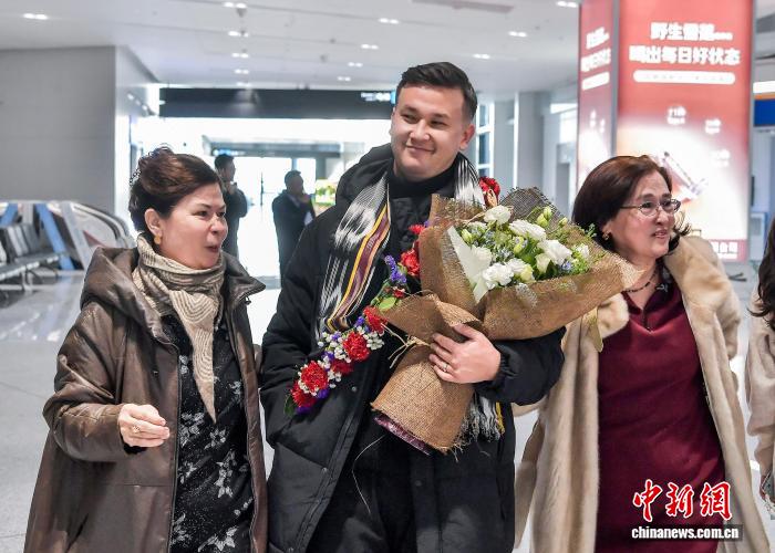 1月4日,新疆黑鲁木全天山邦际机场,由42实客居土耳其的新疆籍侨胞构成的省亲团到达黑鲁木全,等待多时的侨胞支属献上陈花,并密切拥抱,接待他们归抵家城。中新社记者 刘新 摄