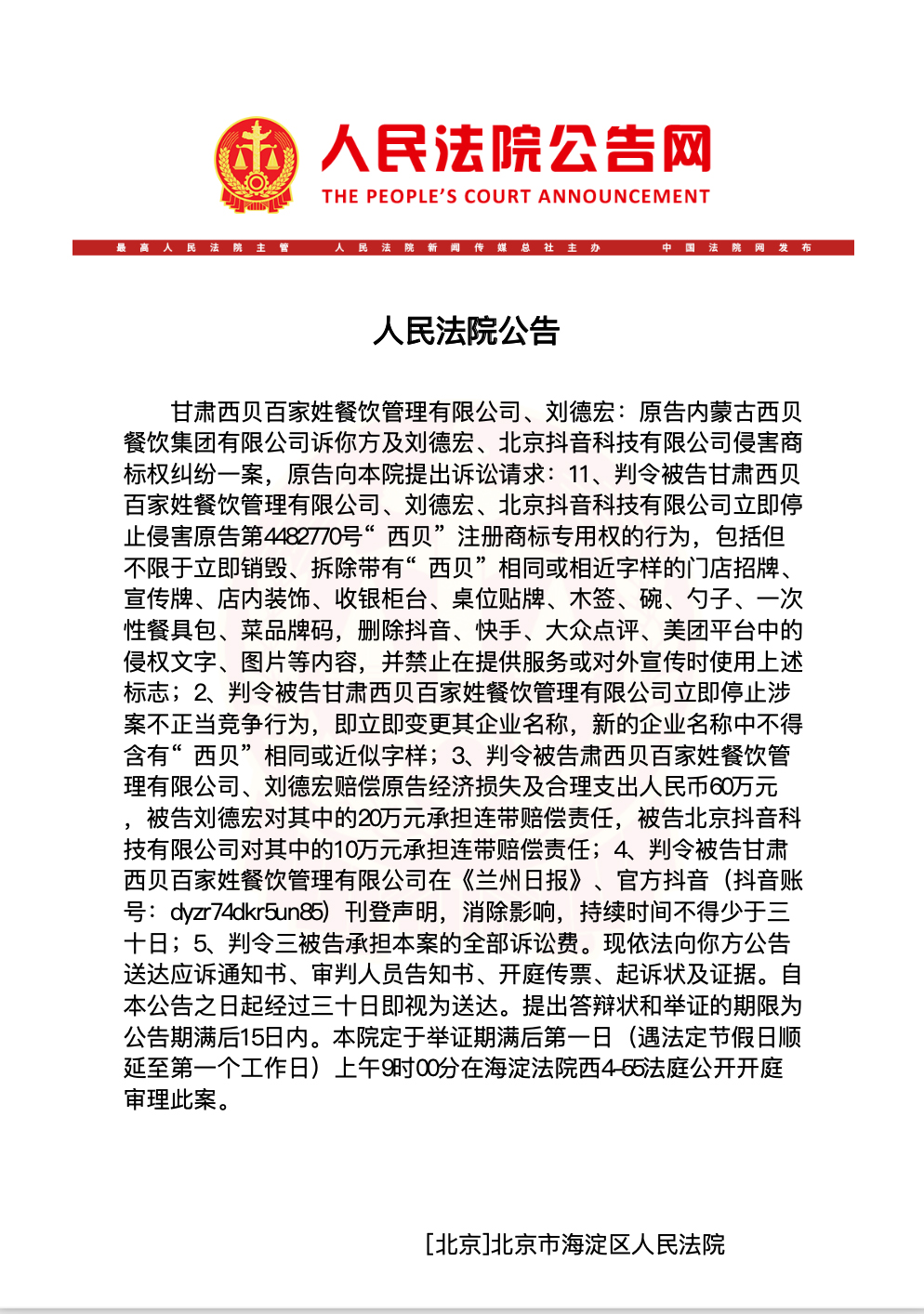 今日本告内乱受古西贝餐饮团体无限公司央求判令原告苦肃西贝百家姓餐饮办理无限公司、刘某某、北京抖音科技无限公司当即遏制侵袭第4482770号“西贝”挂号牌号公用权的举动,包含但没有限于当即废弃、捣毁带有“西贝”相反或者邻近字样的门店字号、宣扬牌、店内乱装点等。