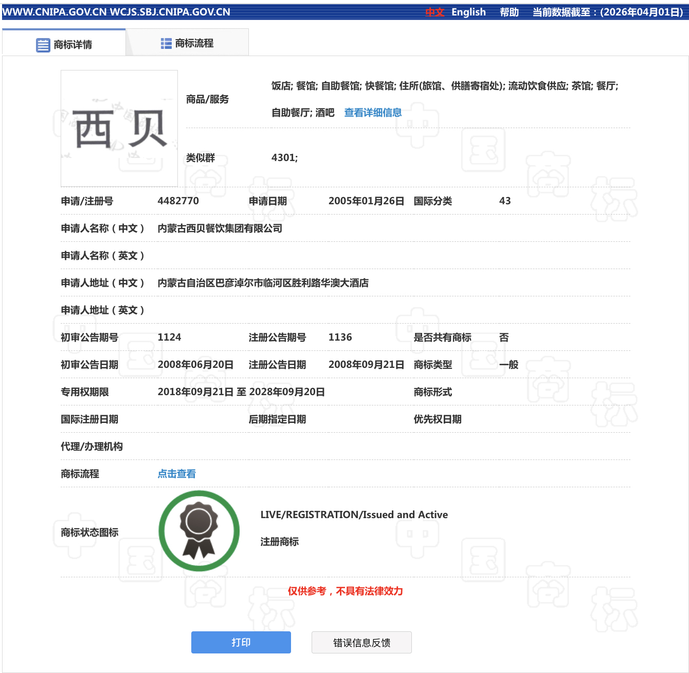 在报纸战抖音号登载阐明,消弭感化,不断技术没有得少于3旬日。 中原字号网表现,第4482770号牌号为1枚“西贝”牌号,该牌号商品/效劳包含:饭馆; 餐馆;自主餐馆等。(完)