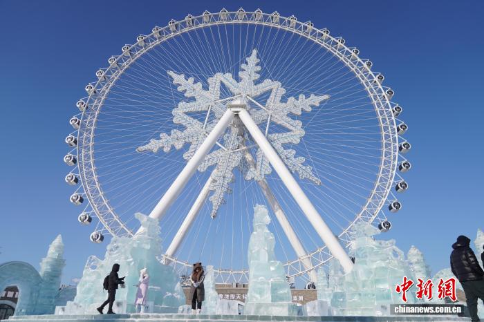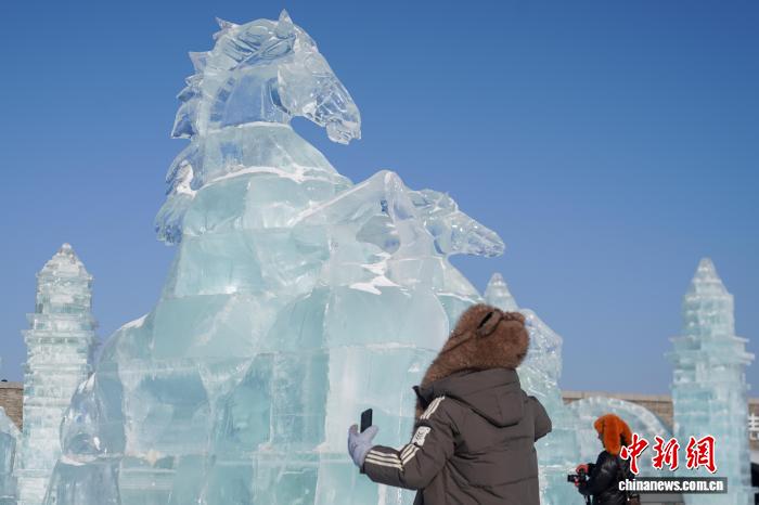 农历马年临近 游客打卡哈尔滨冰雪大世界内 “冰雕马”