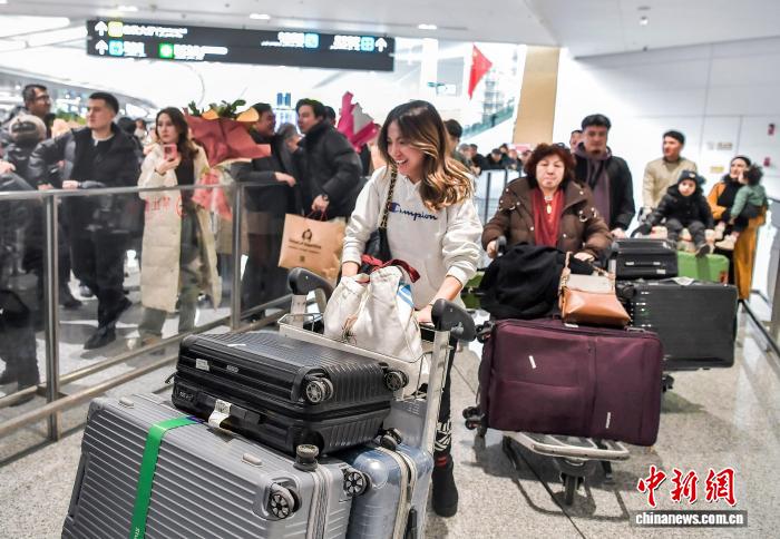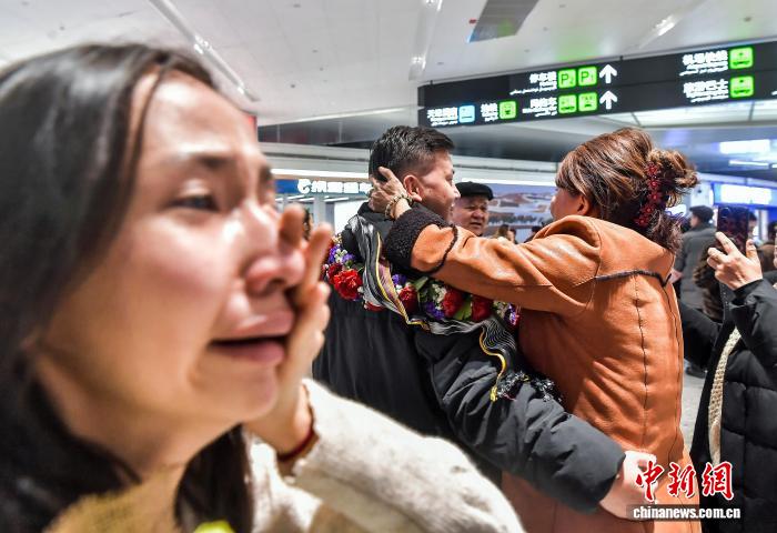 1月4日,新疆黑鲁木全天山邦际机场,由42实客居土耳其的新疆籍侨胞构成的省亲团到达黑鲁木全,等待多时的侨胞支属献上陈花,并密切拥抱,接待他们归抵家城。中新社记者 刘新 摄